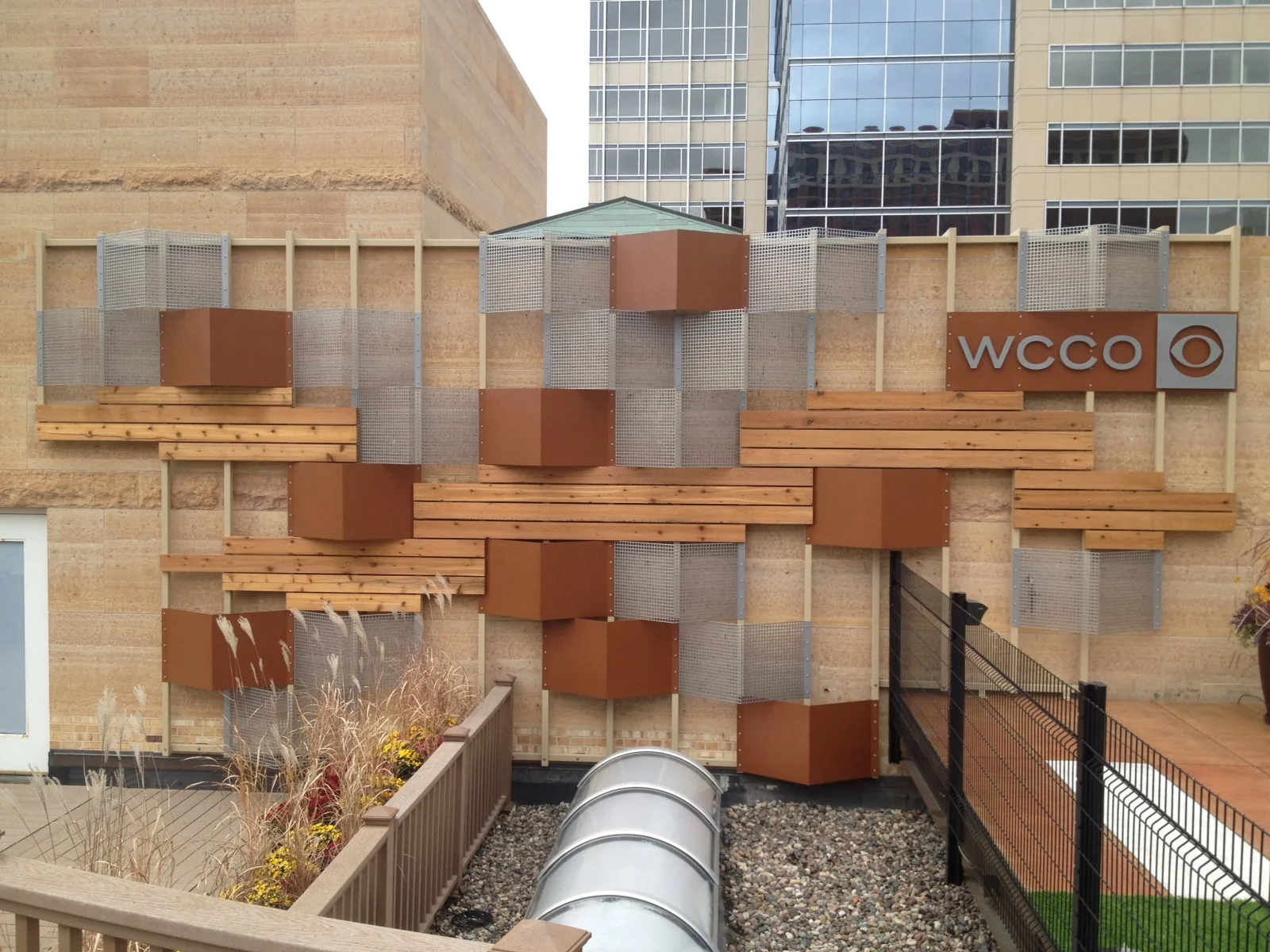 Custom wall sculpture for roof top deck of WCCO downtown Minneapolis.